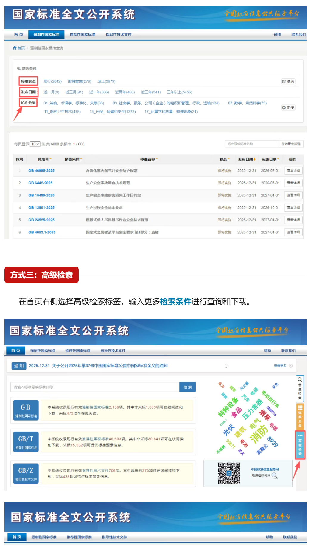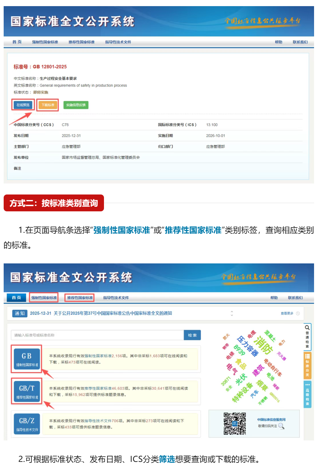 国家标准全文免费公开一年来可下载国家标准数量从1500多项增加到32000多项有效满足了企业和社会公众需求产生了积极的影响截至2025年12月31日国家标准全文公开系统全年浏览量达1亿多次全年在线阅读量和下载量超千次的国家标准达10000多项超万次的国家标准达800多项其中安全生产、危险化学品安全、电动自行车安全等方面标准在线阅读量和下载量持续居于高位如何利用国家标准全文公开系统(网址:https://openstd.samr.gov.cn/bzgk/gb/index)查询下载标准?以下三种方式↓↓↓